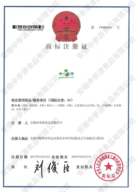 中参源商标注册证